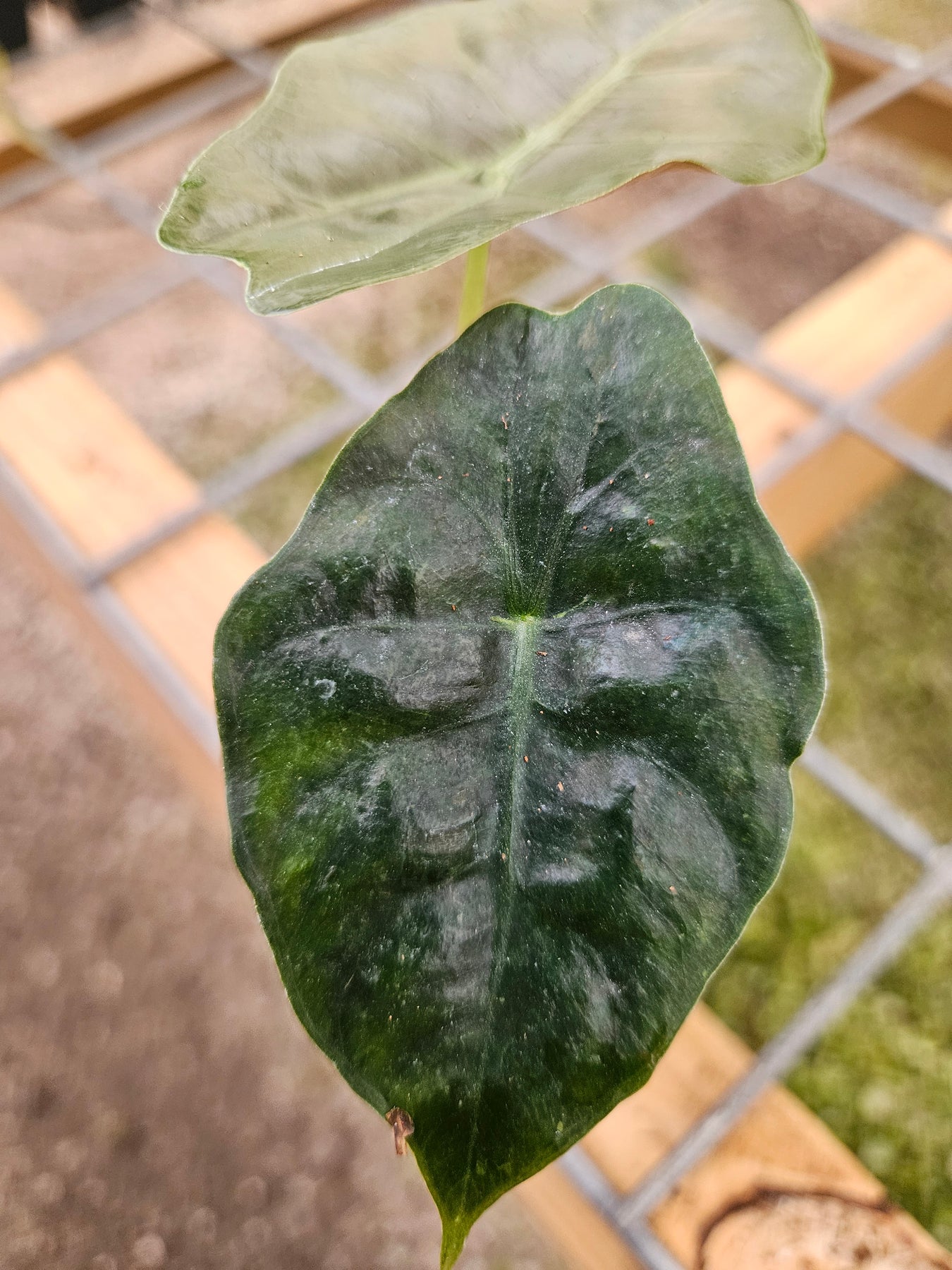 The Alocasia Chantrieri, often called the African Mask Plant or Metallic Alocasia, is a striking species prized for its dark, velvety leaves and silvery-green veins that shimmer under the light. The foliage has a rich, almost metallic sheen—deep emerald with subtle bronze tones on the undersides—that makes it look more like living art than a houseplant. With its dramatic form and bold contrast, it’s a favorite among collectors and statement-plant enthusiasts alike.