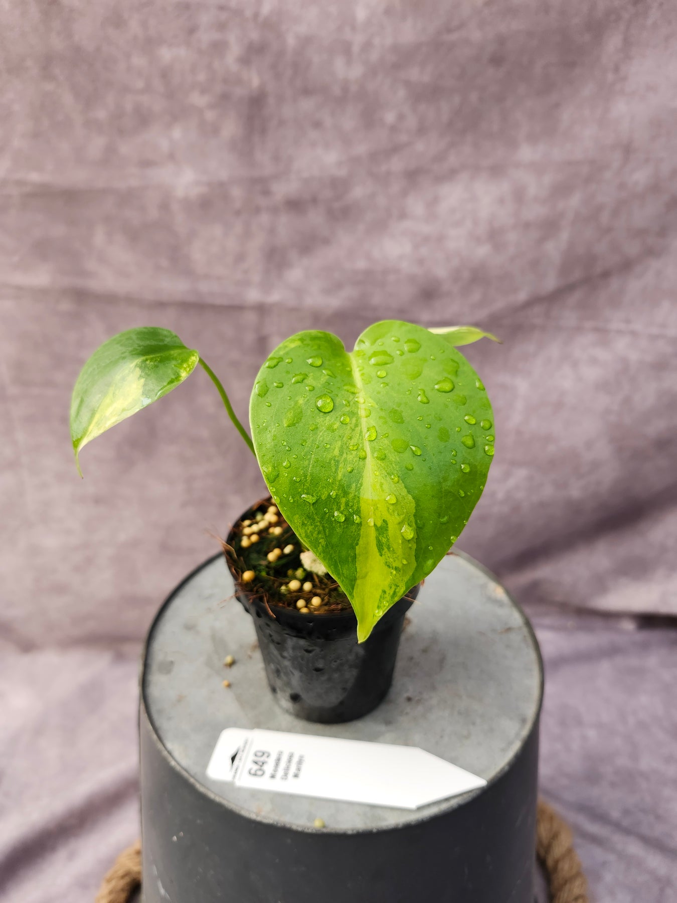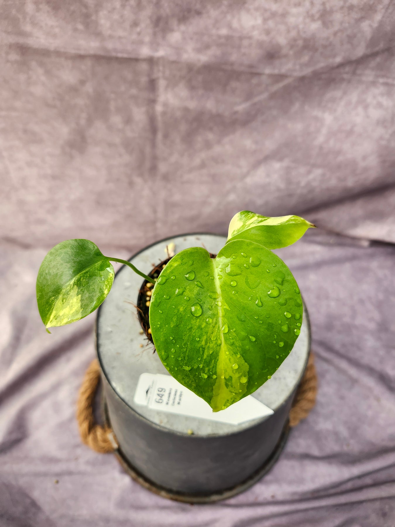 - Foliage: Large, heart-shaped leaves with splits and holes; marbled cream, mint, and green variegation