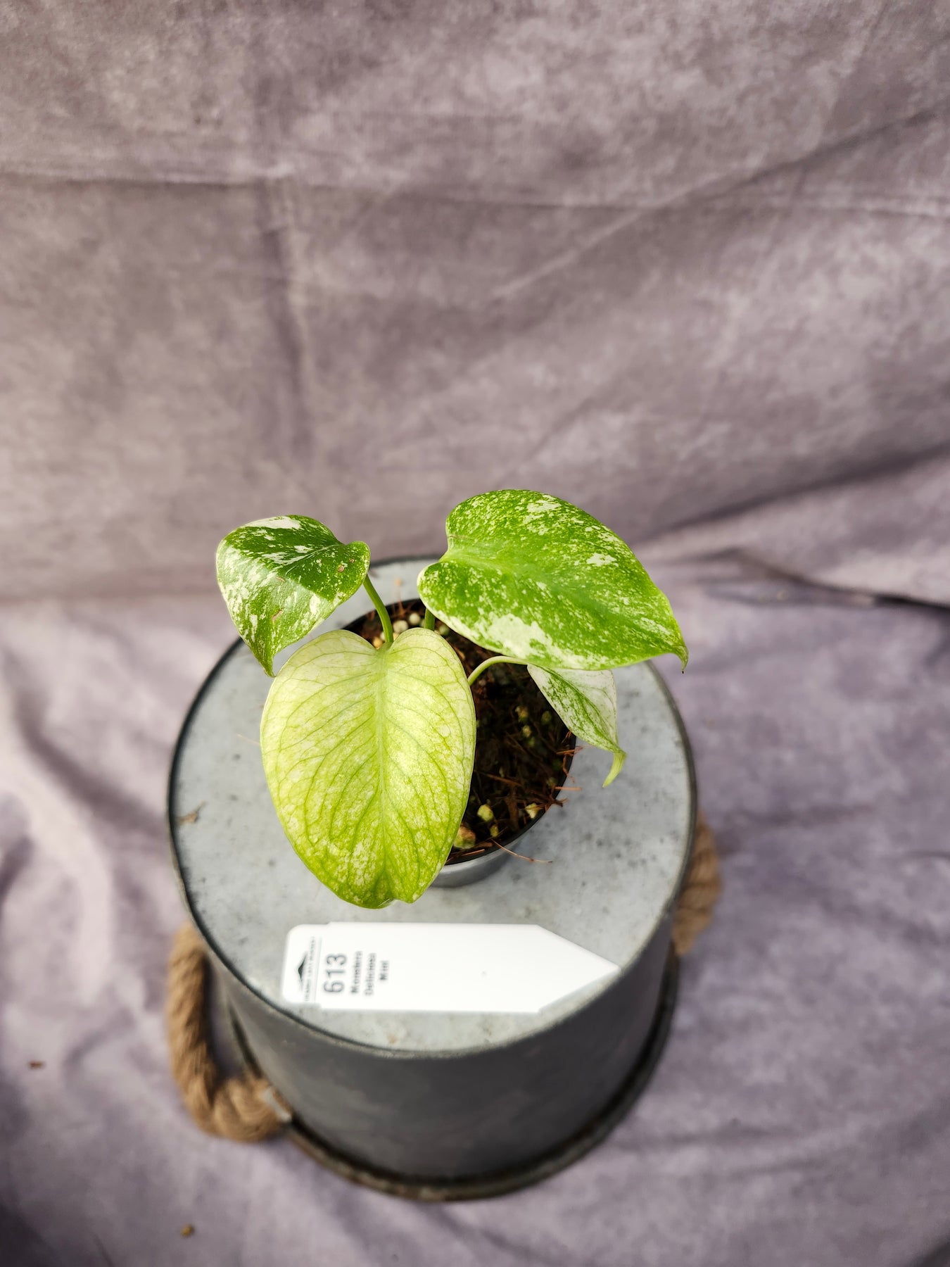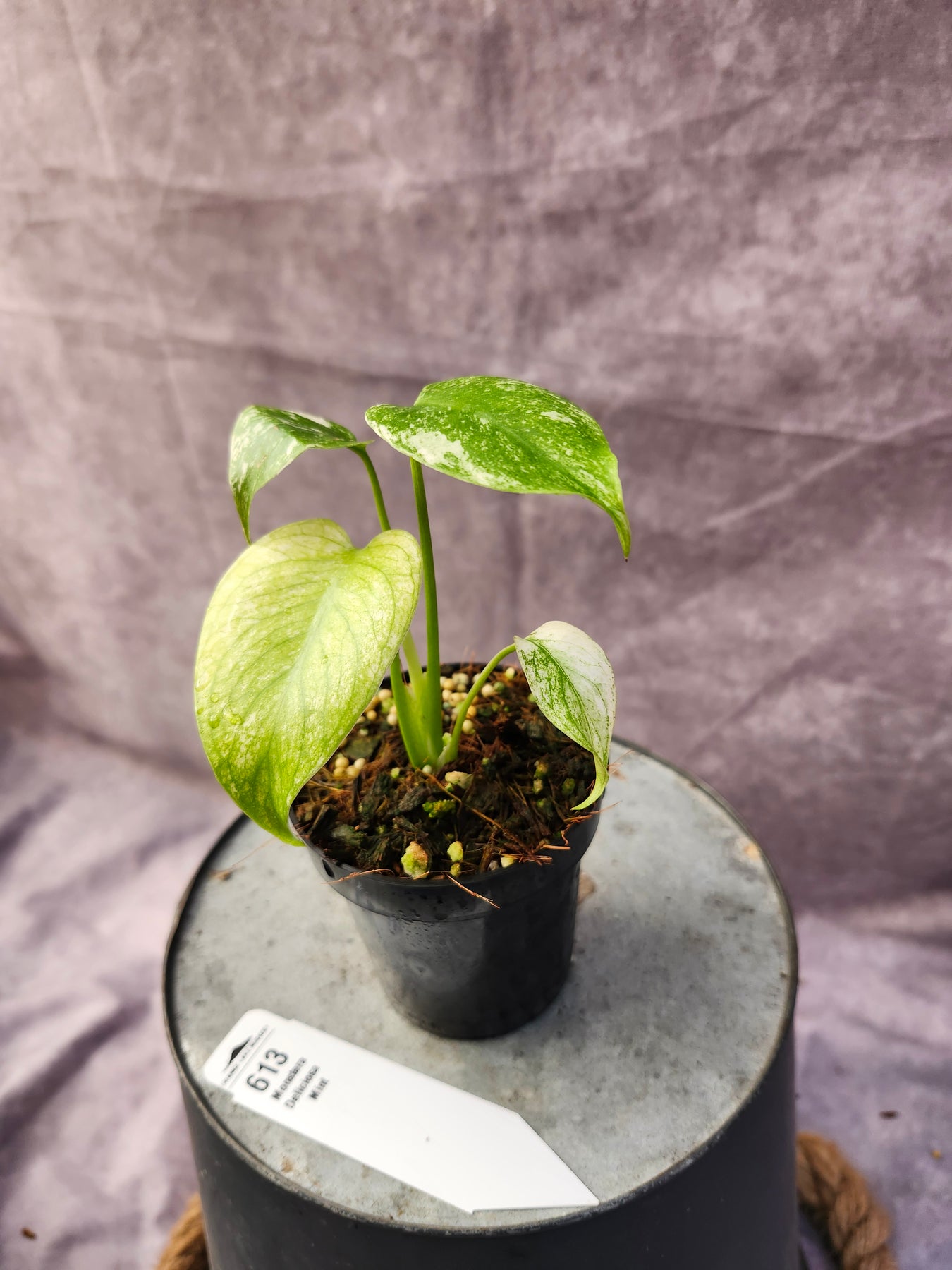 - Foliage: Large, heart-shaped leaves with splits and holes; marbled cream, mint, and green variegation