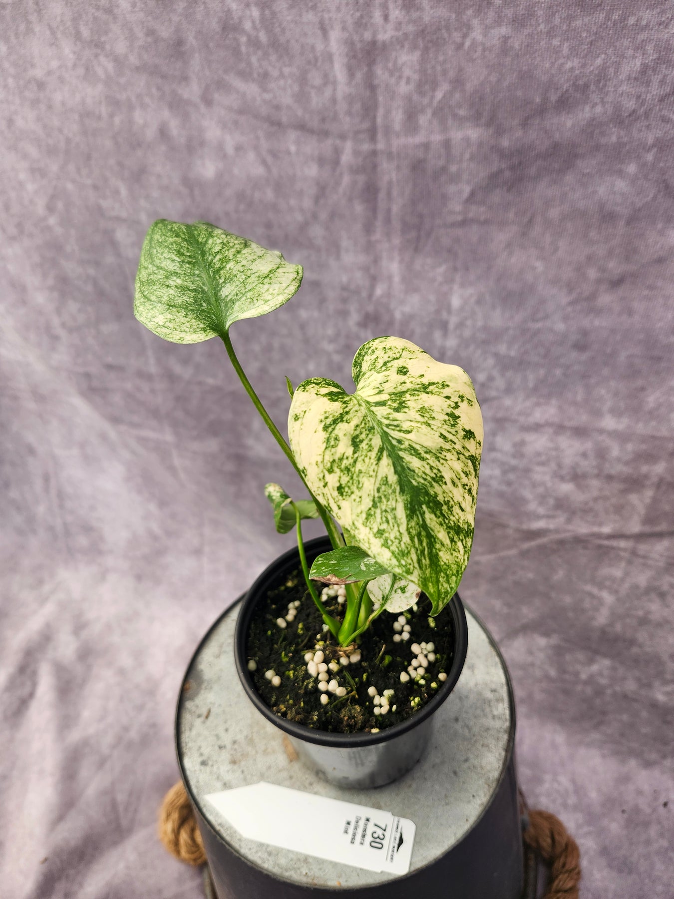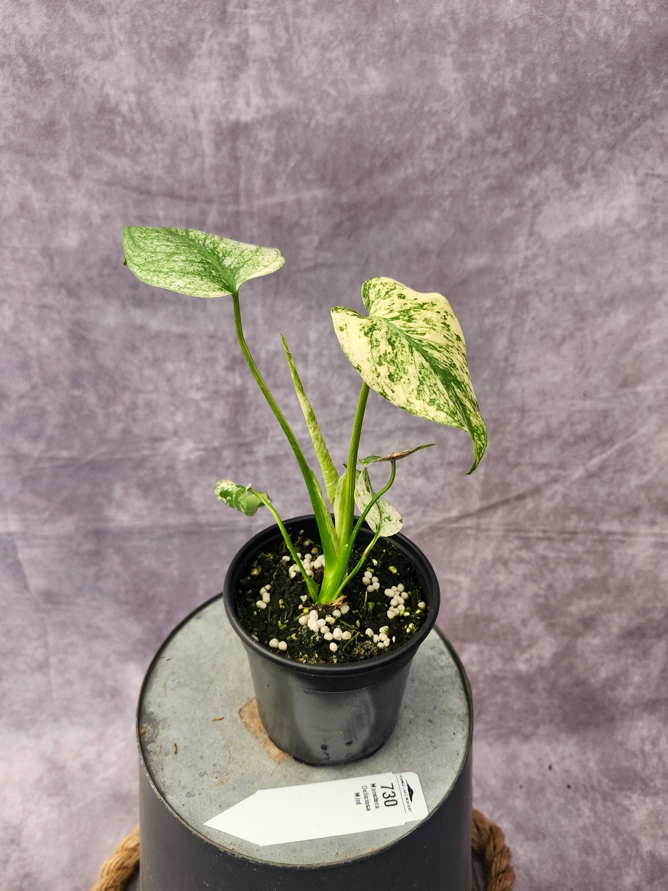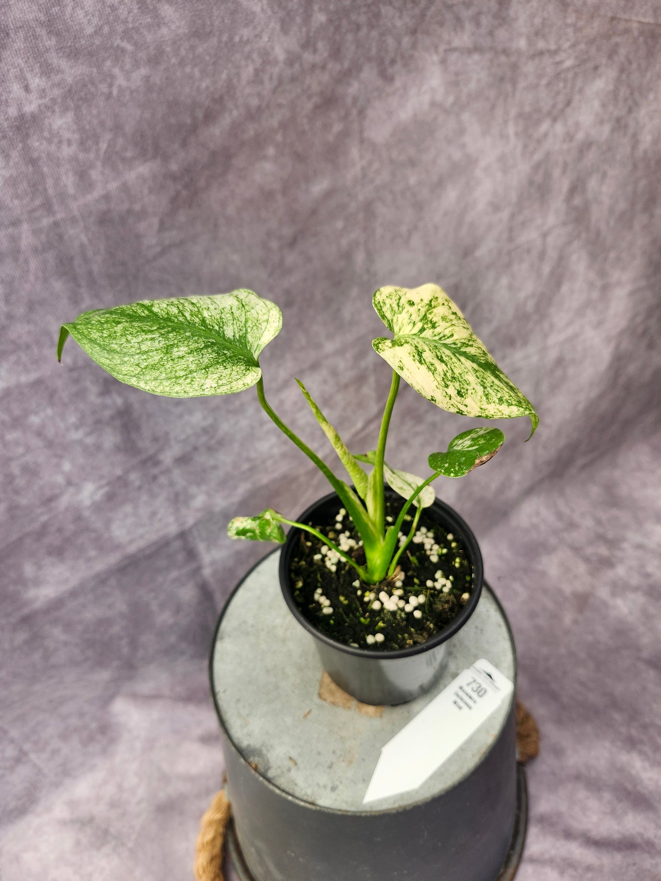 - Foliage: Large, heart-shaped leaves with splits and holes; marbled cream, mint, and green variegation