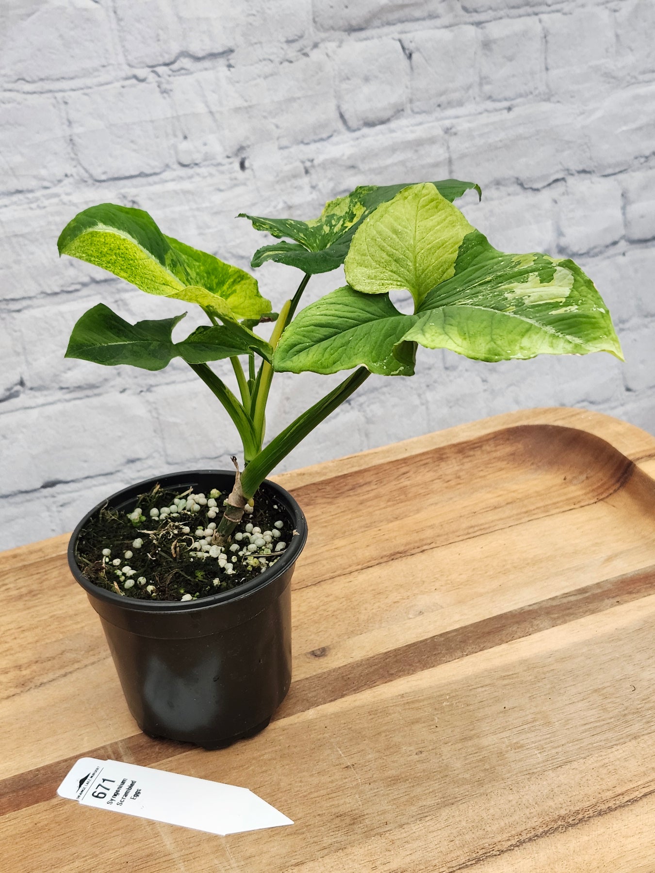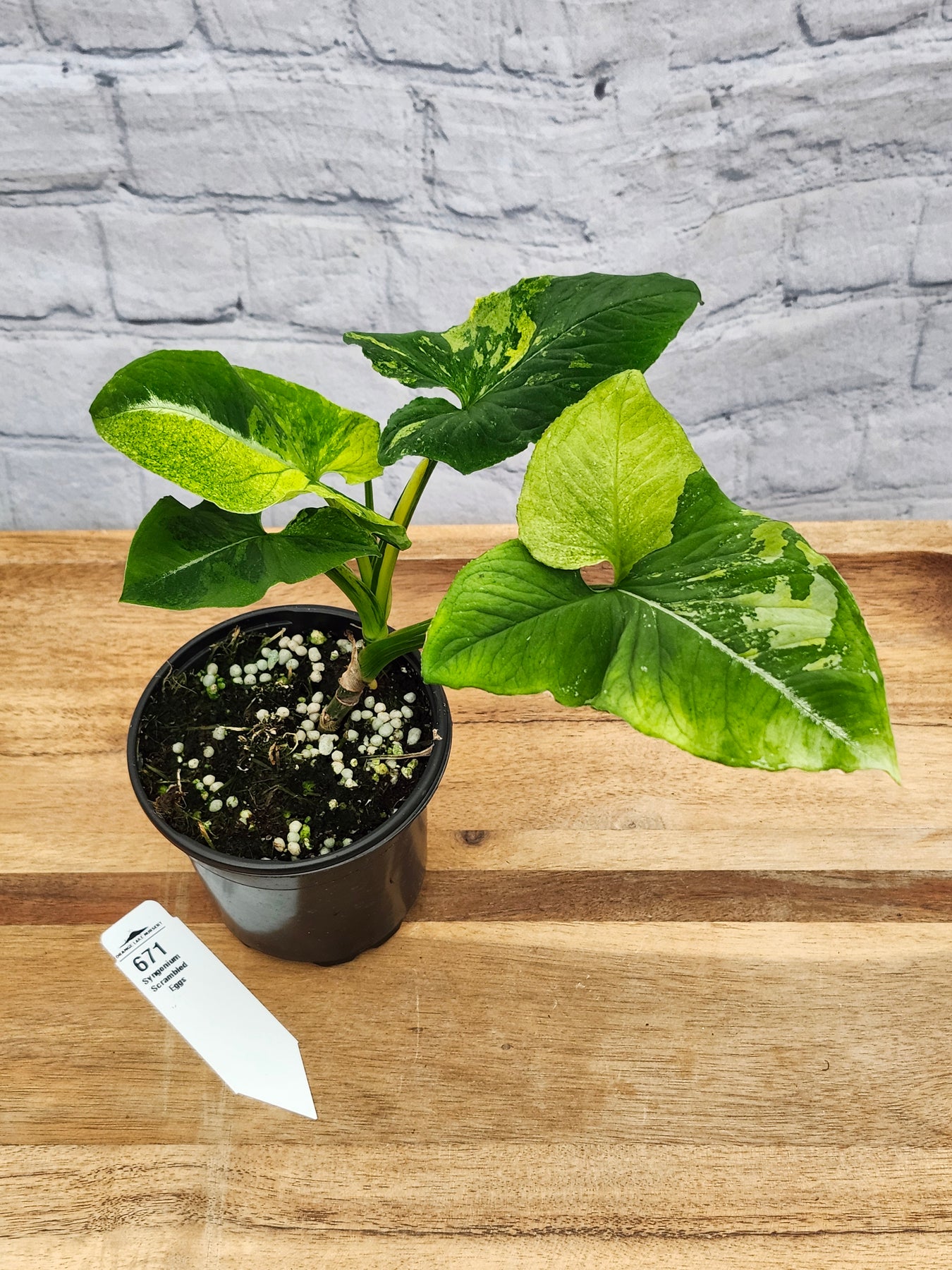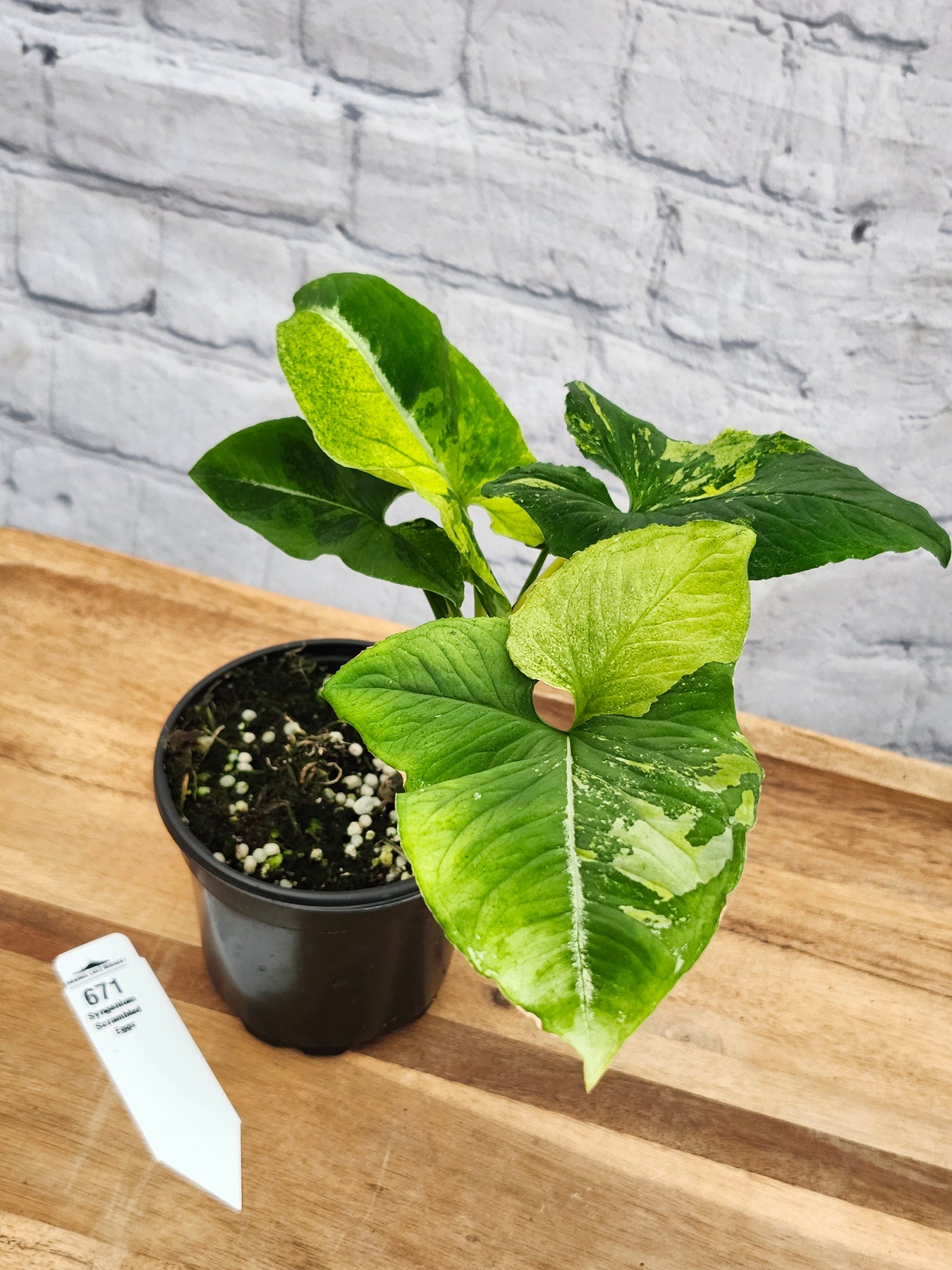 Introducing the Syngonium Scrambled Eggs- one of the newest members of our jungle here at Orange Lake Nursery. It's an eye-catching houseplant known for its striking variegated foliage. The leaves showcase a mix of vibrant yellow and green hues, resembling scrambled eggs. This delightful and visually appealing Syngonium variety adds a pop of color to any indoor space